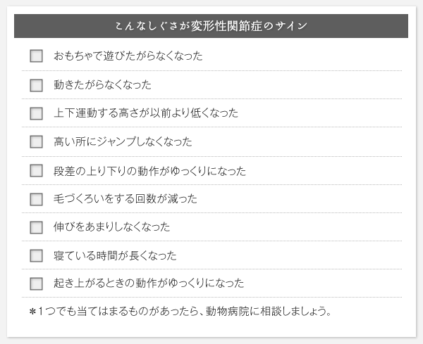 他の病気と同様に、変形性関節症も早期に発見して早めに治療を開始することが大切です。上記にあげた病気のサインのチェックポイントは、どれも中高齢の猫によくみられることから、単純に「年のせい」だと思われがちですが、その陰に変形性関節症が潜んでいる可能性は大。「もう年だからしかたがない」と飼い主があきらめてしまえば、猫はコントロールできるはずの慢性的な痛みを我慢しながら、ずっと苦痛の日々を送らなければなりません。